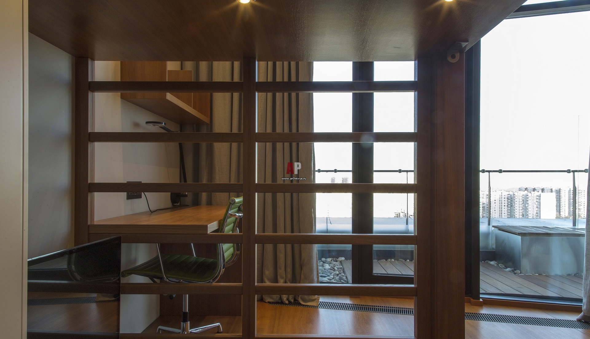 Детская комната мальчика. Рабочая зона размещена на подиуме. Кровать объединена с зоной отдыха на втором уровне. Двухъярусная мебель, подиум, перегородки из тика, изготовление «КингВуд».