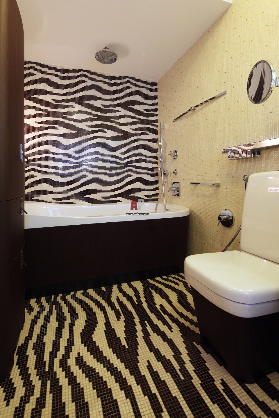 Интерьер хозяйской ванной комнаты в черно-белой гамме. Стена за ванной и пол выложены мозаикой с рисунком «зебра». Сантехника, Duravit, Esplanada.