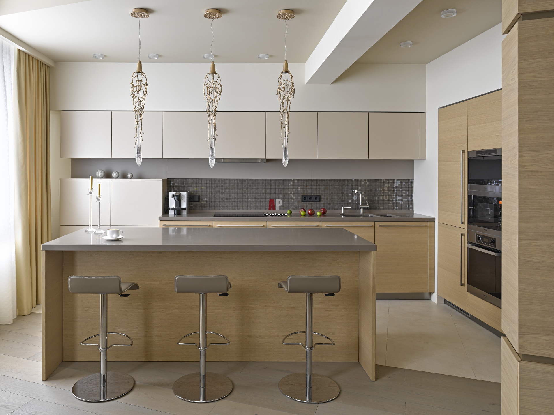 В основе дизайна гостиной – модель немецкой фирмы Leicht. Кухонный гарнитур имеет современную форму, выполнен из двух фасадных материалов – светлый шпон дуба и лакированная поверхность МДФ в песочных оттенках. Отдельным элементом в кухне является остров - барная зона со стульями. Он придает помещению непринужденность и подчеркивает современный стиль интерьера.