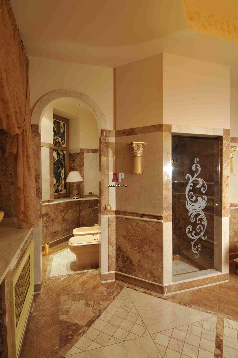 Размер помещения позволил комфортно разместить на площади зону ванной и душевой, отделив от них пространство с сантехнической функцией. Дверь душевой украшена рисунком, выполненным в пескоструйной технике.