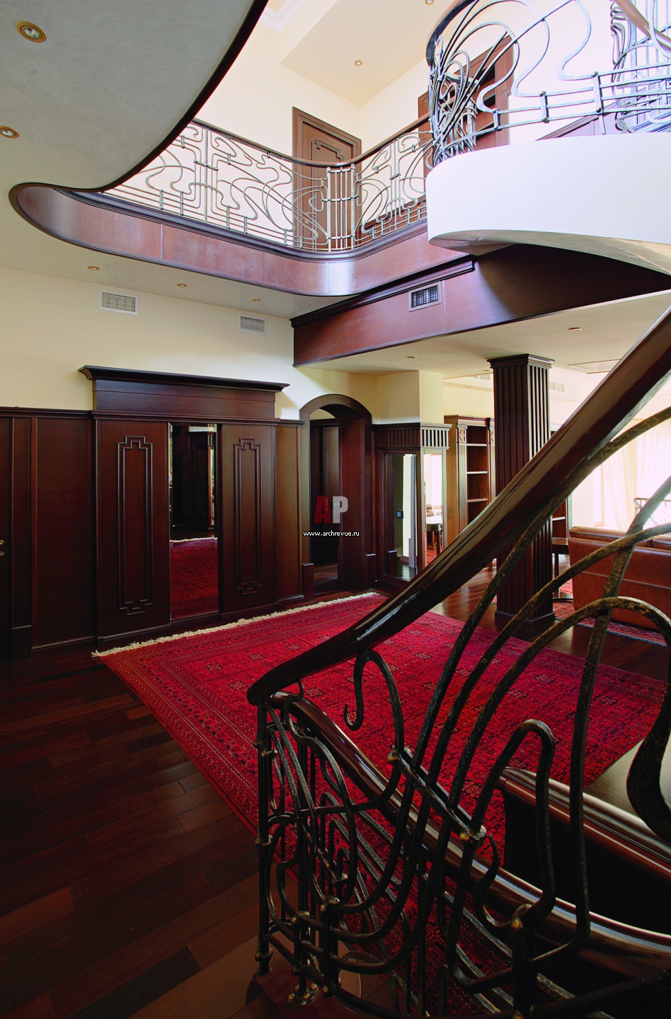 Интерьер двухсветного просторного холла формирует волнообразная лестница и панели из темного дерева.