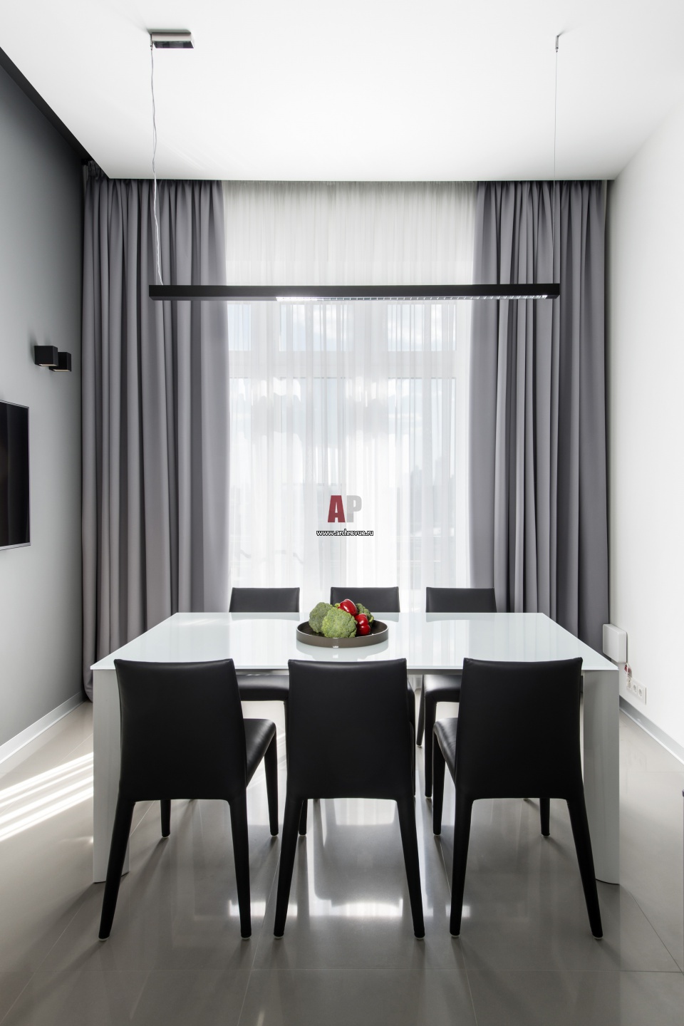 Зона столовой для торжественных застолий в минималистском мужском интерьере. Белый стол со стеклянной столешницей контрастирует с кожаными черными стульями.