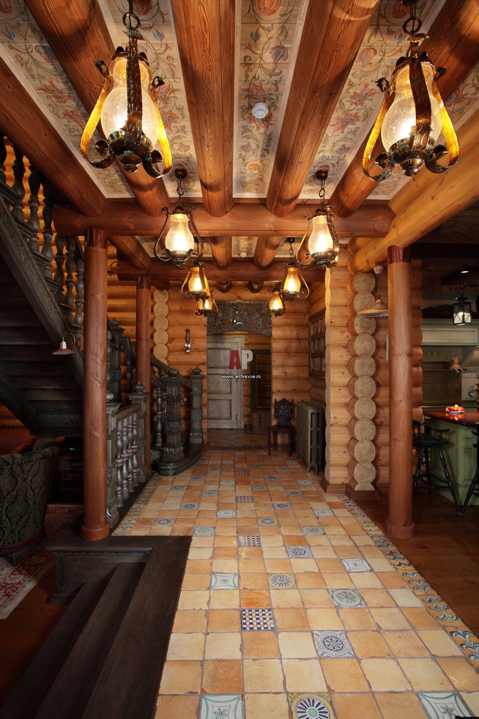 Прихожая в деревянном доме выполнена в традиционном русском сказочном стиле. Сосновая доска на потолке вручную расписана и искусственно состарена, в основе орнамента – стилистика фольклора. На полу – керамическая плитка терракотового цвета.