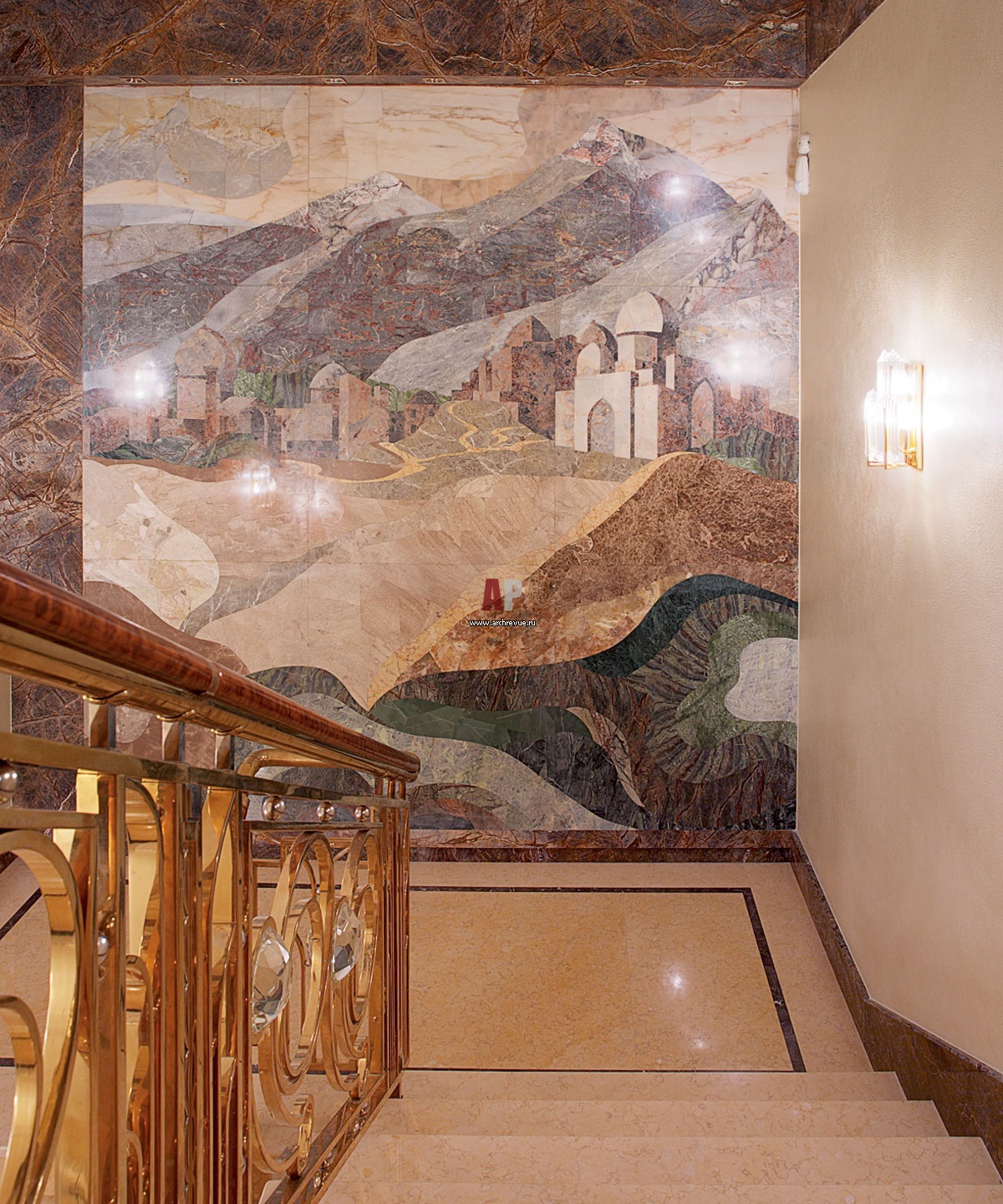Лестничный пролет декорирован панно с изображением горного пейзажа. Панно выполнено из нескольких сортов натурального камня разного оттенка и выглядит очень живописно.