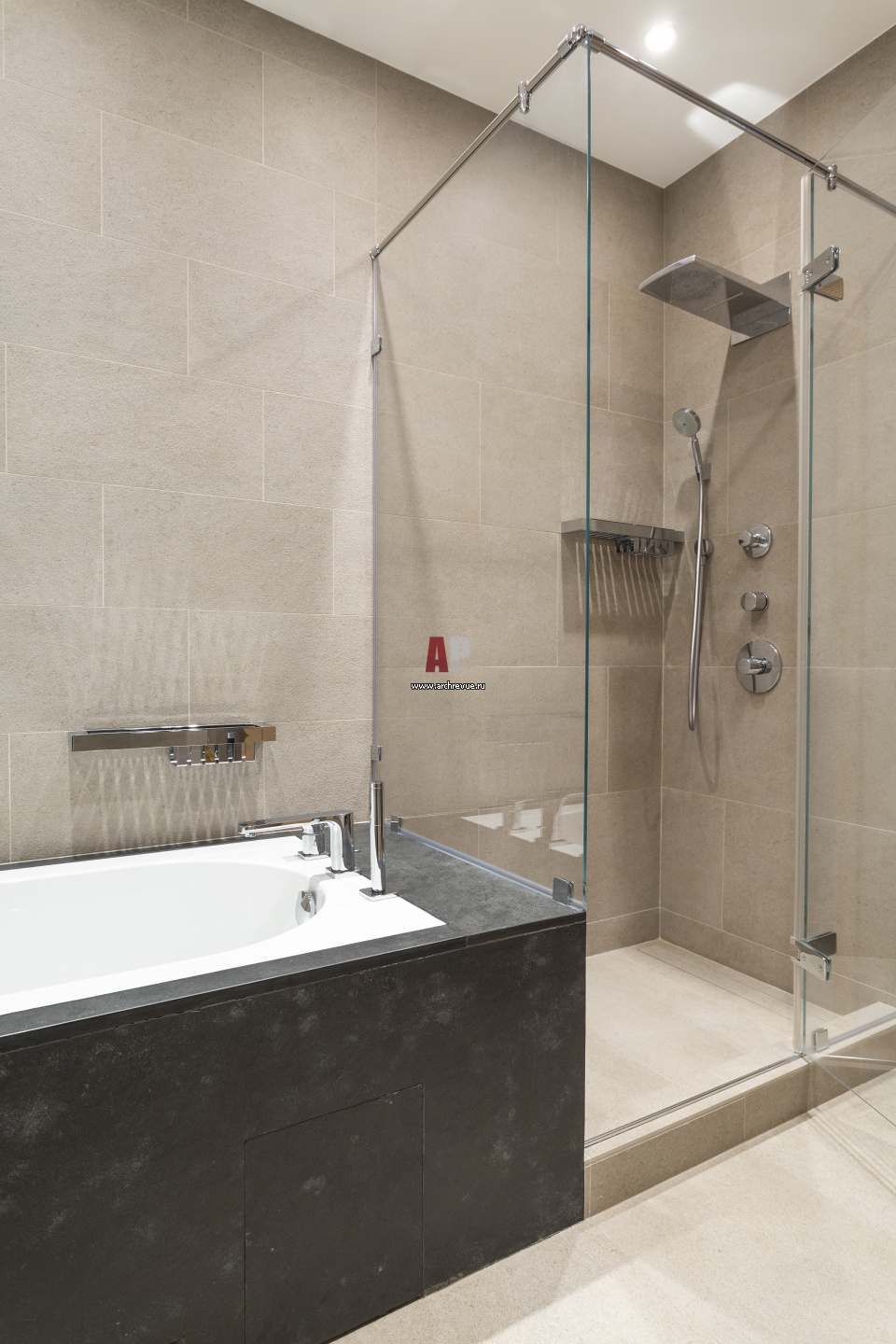 Передняя панель ванны – черный сланец. Ванна, Villeroy & Boch, модель Oberon. Душевая из прозрачного стекла, Hueppe. Лейка в душе, Hansgrohe.