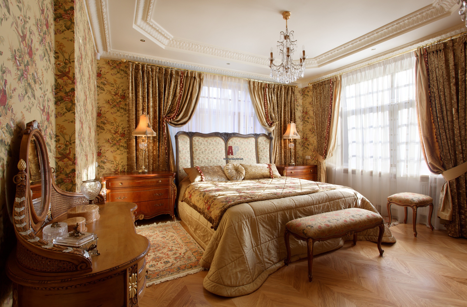 Хозяйская спальня – богато украшенное пространство. Особое внимание в доме уделено декору окон. Он создавался индивидуально для каждой зоны с использованием большого количества разных тканей: гобеленовых тканей, шелка, бархата и кружев.