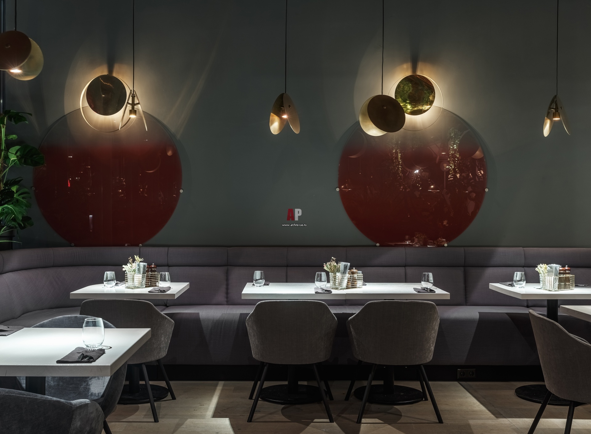 Тему круга, заданную формой 2-х метрового гриля, поддерживают круглые стеклянные панно градиентом в цвет насыщенно бордового потолка.