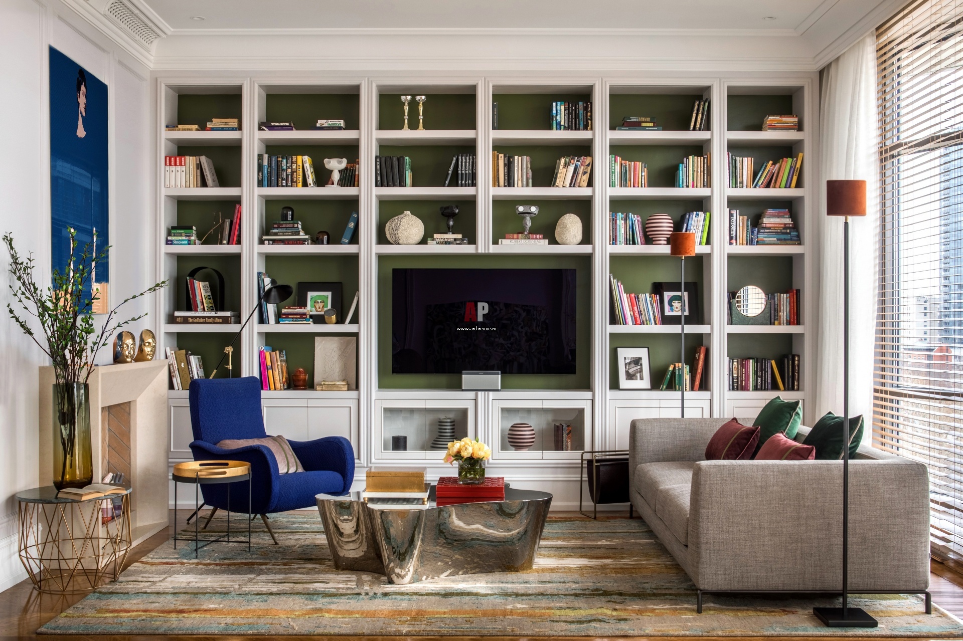 Стены в гостиной окрашены сложным пастельным оттенком краски теплым подтоном, Little Greene, Down №242. Задняя поверхность открытых шкафов оформлена контрастным оливковым, Little Greene, Olive №72.