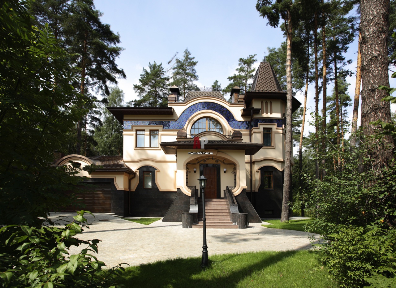 Стилистику дома определила его архитектура с готической башней, круглыми окнами и полукруглой входной группой.