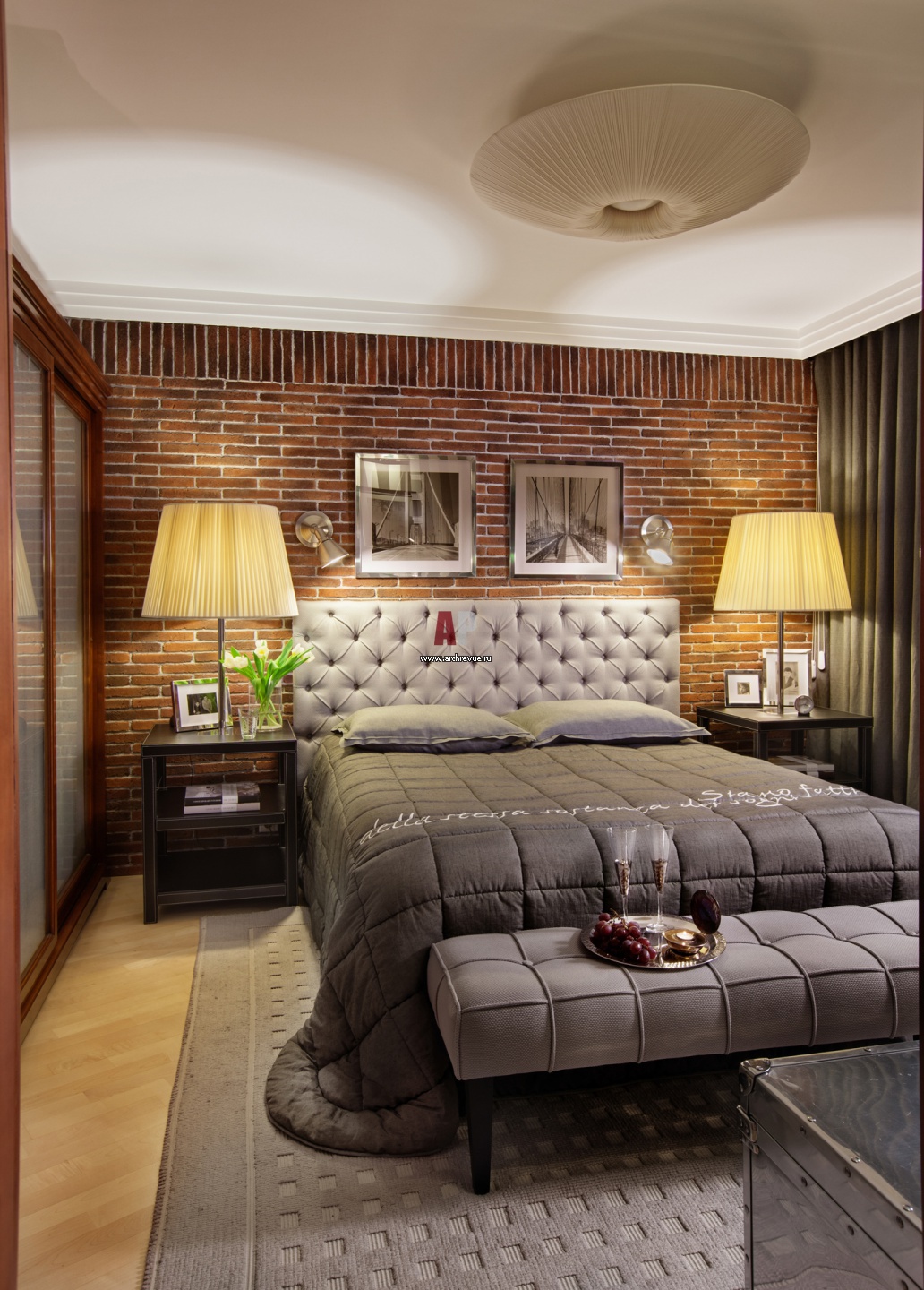 На фото – спальня в стиле брутальный шик. На стенах – искусственный кирпич терракотово-красного цвета, имитирующий старинную кладку. Кровать, Lambert.