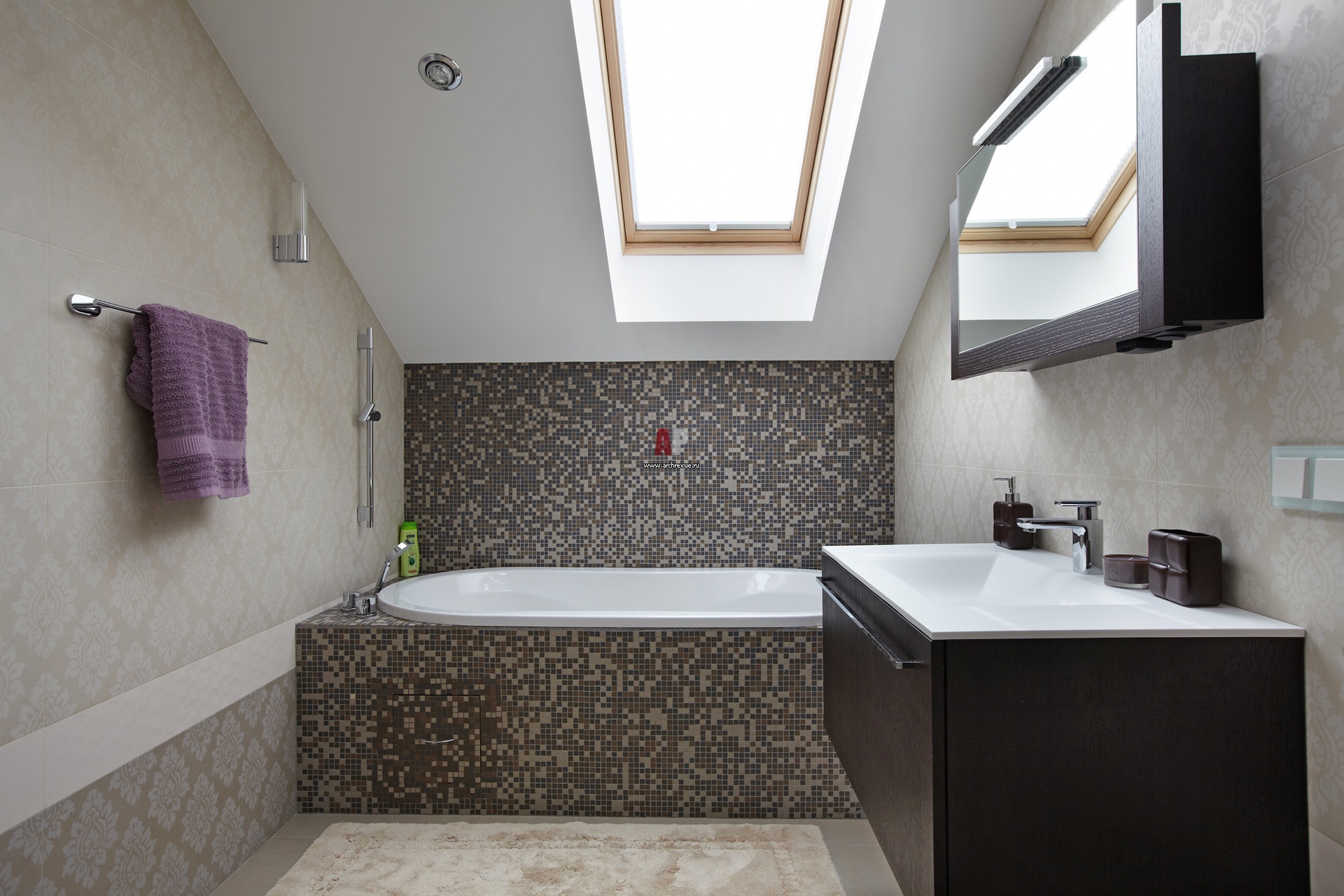 Фото интерьера санузла с наклонной кровлей и мансардными окнами. Плитка с орнаментом «Дамаск» светлого бежевого цвета. Ванна облицована коричнево-кофейной мозаикой. Мансардное окно в деревянной раме, VELUX.