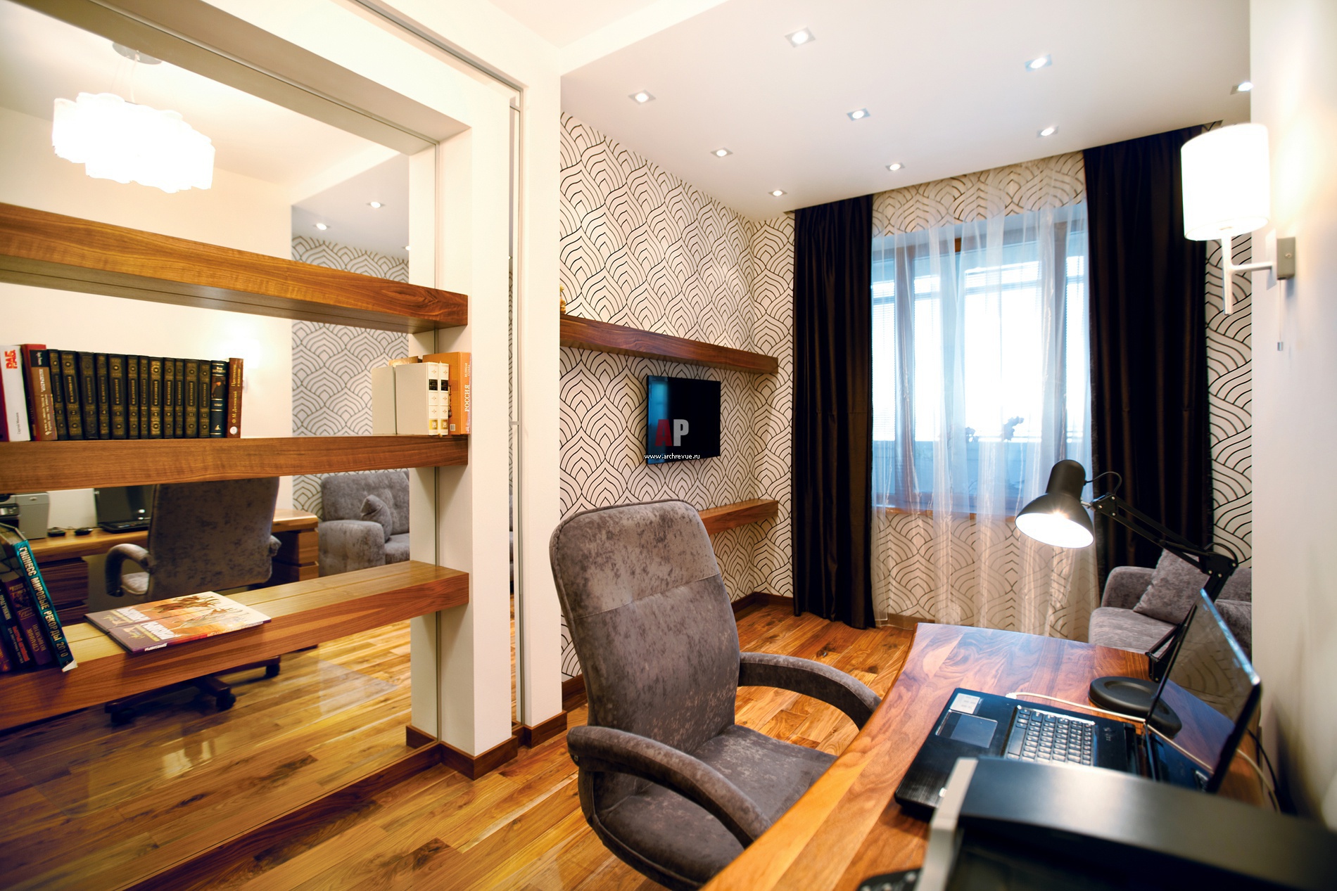 Кабинет в современном стиле. Зеркала визуально расширяют и усложняют помещение. Рабочий стол, по чертежам авторов проекта.