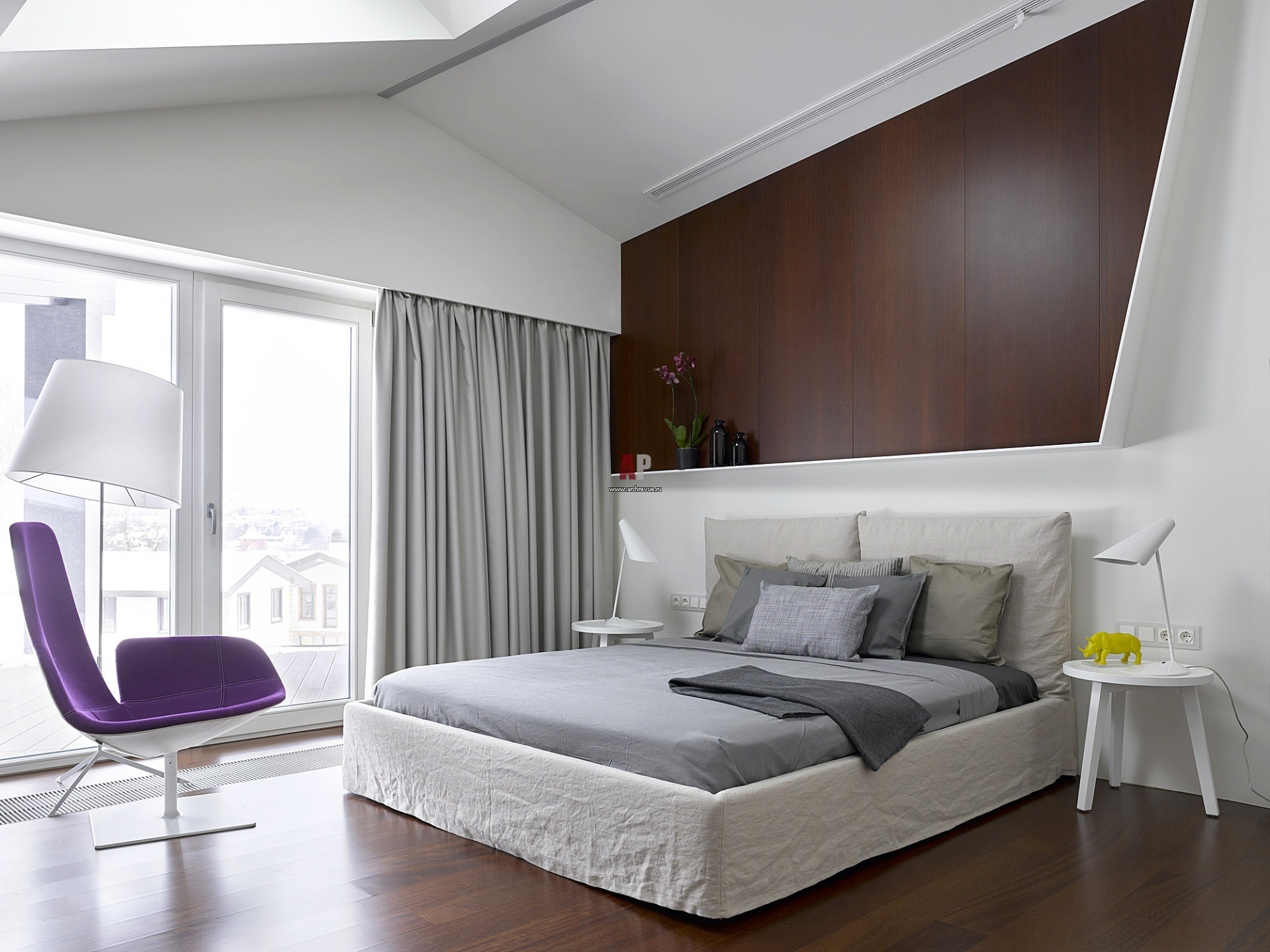 Интерьер хозяйской спальни на втором этаже с выходом на открытую террасу. Светильники, Vibia. Кровать, Bonaldo. Прикроватные столики, Gervasoni. Кресло, Moroso. Ассиметричная полка над кроватью из тонированного дуба сделана на заказ.