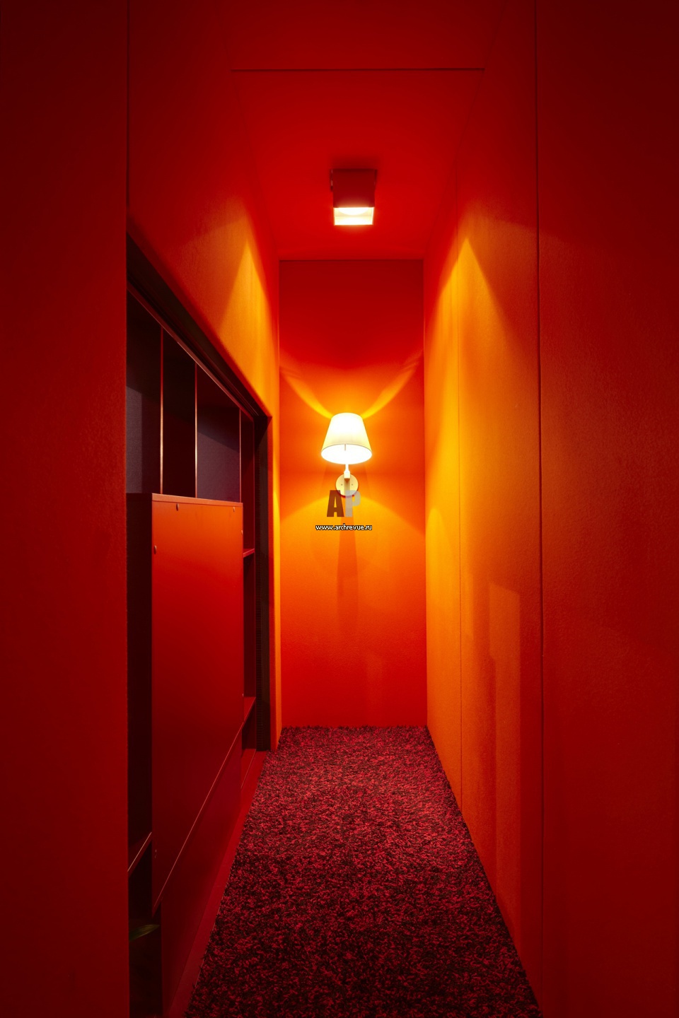 Холл с местами для отдыха сотрудников и приглушенным светом.