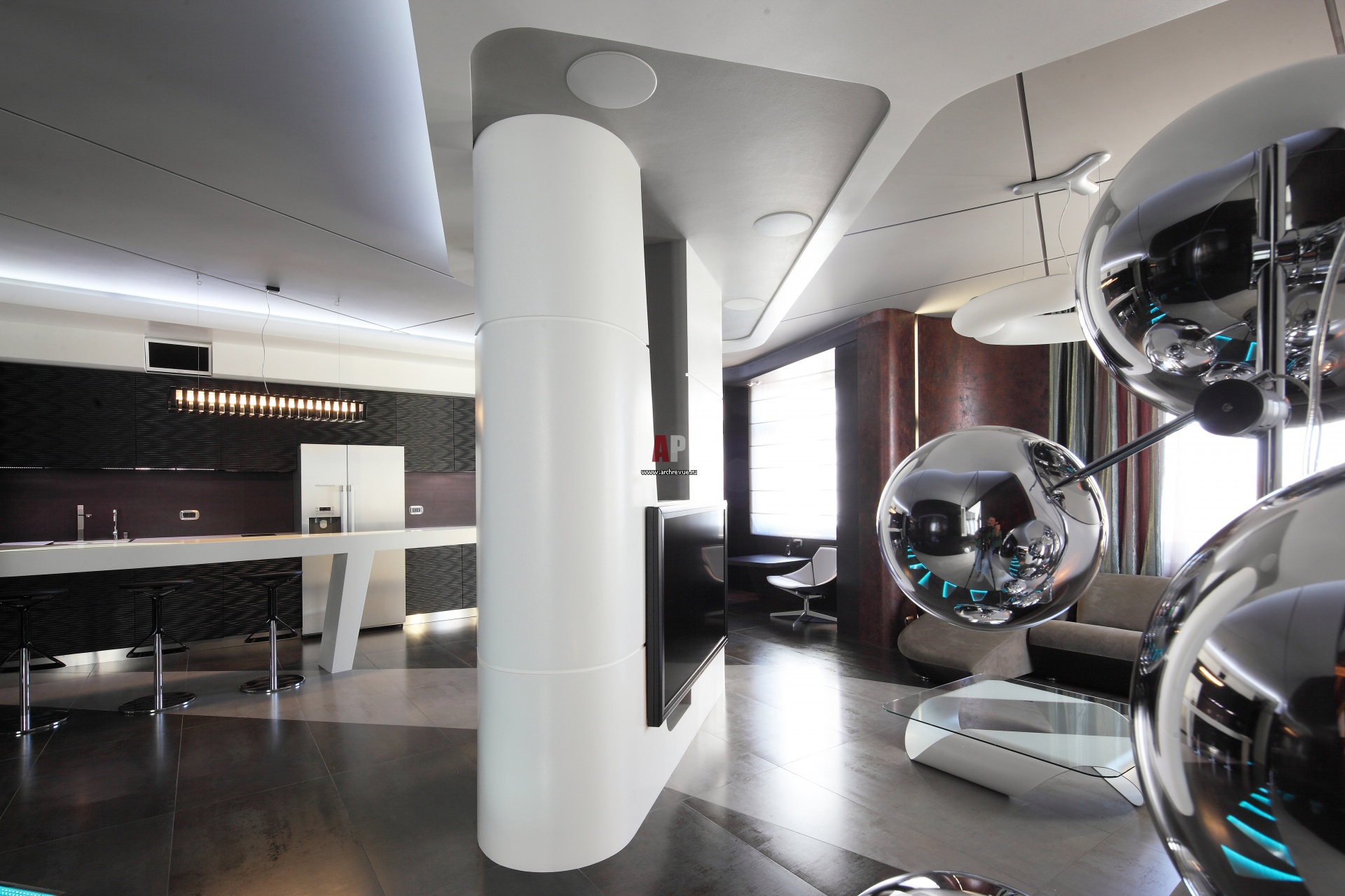 Освещение в квартире сценарное. Световые потоки регулируются с помощью нескольких сенсорных панелей. Одним нажатием кнопки включаются запрограммированные группы света с определенной яркостью, которые ориентированы на время суток и род занятий. Оригинальные светильники итальянской компании Artemide, Next и Dark соседствуют с закарнизным потолочным светом и спотами.