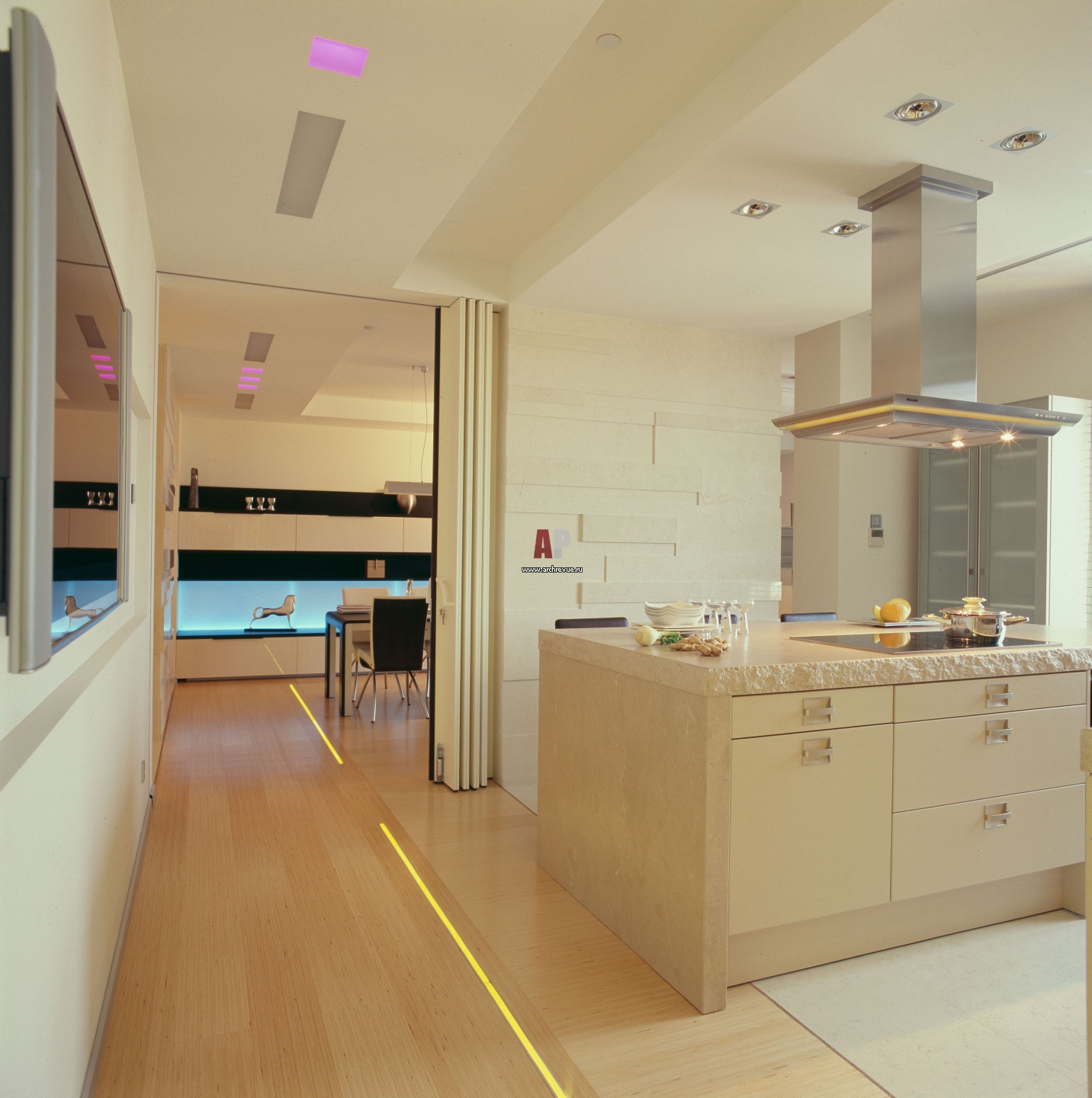 Через всю квартиру проходит ось анфилады, она делит объем на две части - левый жилой правый служебный, примыкающий к несущим колоннам. В полу и на потолке вдоль всей анфилады расположены акцентирующие каждую зону светодиодные светильники.