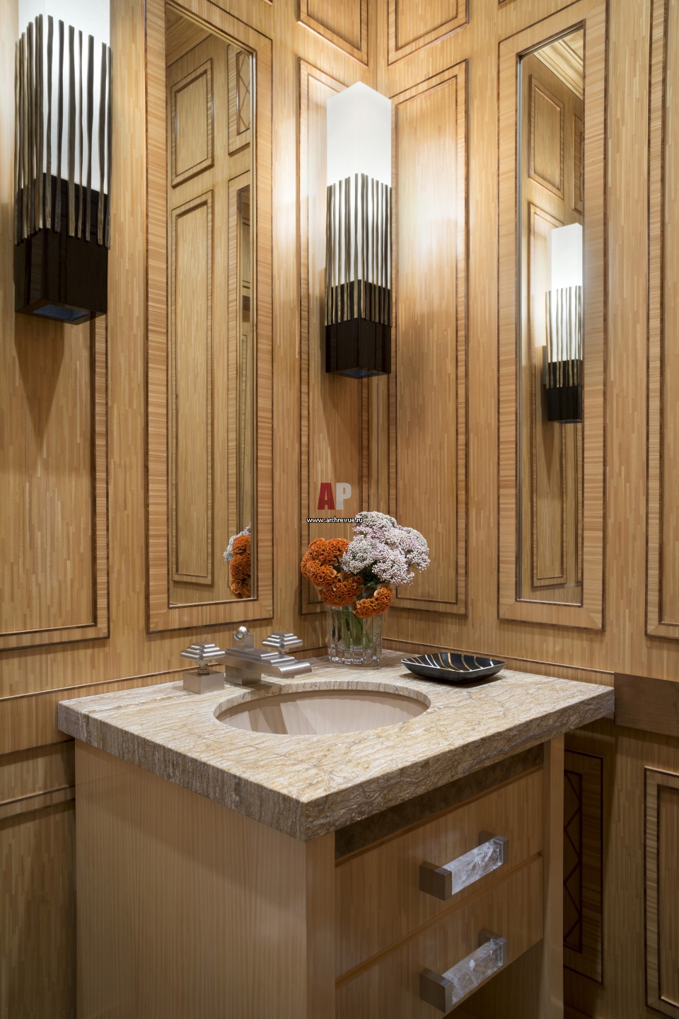 Стеновые панели в гостевом санузле имитируют маркетри из соломы, они сделаны из тонких полосок шпона дерева на заказ. Бра, Van Der Straeten. Ручки ящиков, горный хрусталь.