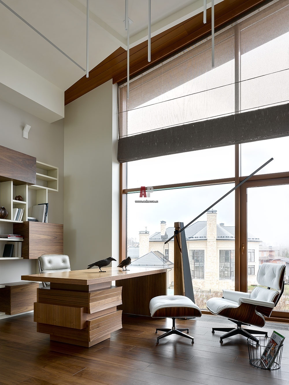 Кабинет на втором этаже. Панорамное окно оформлено контрастной темной рамой. Письменный стол, Galimberti Nino, модель Quadria. Рабочее кресло и оттоманка, Vitra. Стеллажи, на заказ. Декоративные скульптуры из бронзы.
