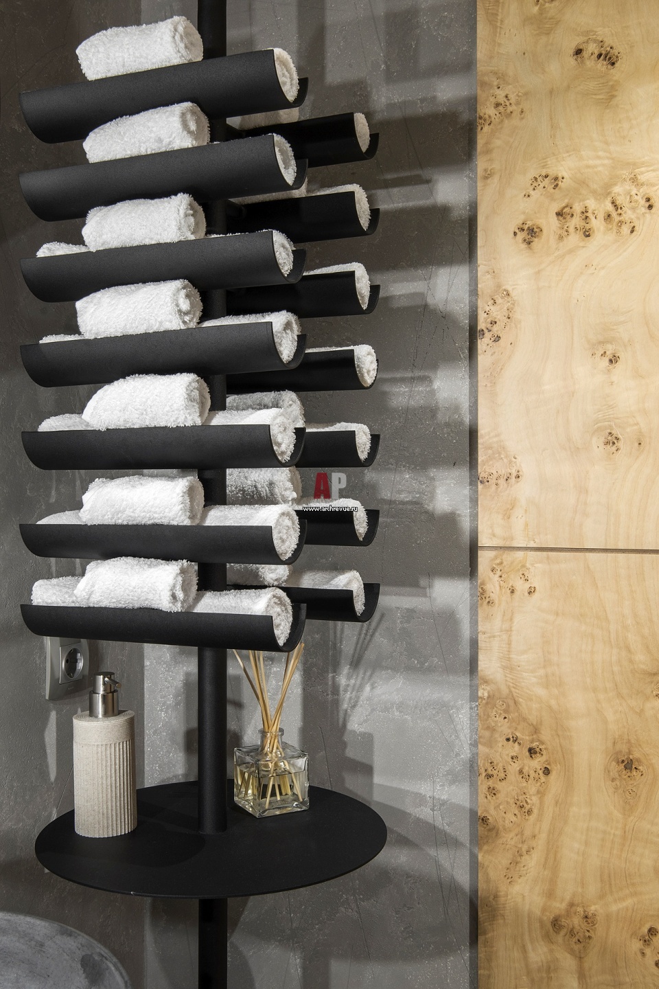 Часть стен в санузле зашита панелями из светлого дерева с «узелковым» рисунком.