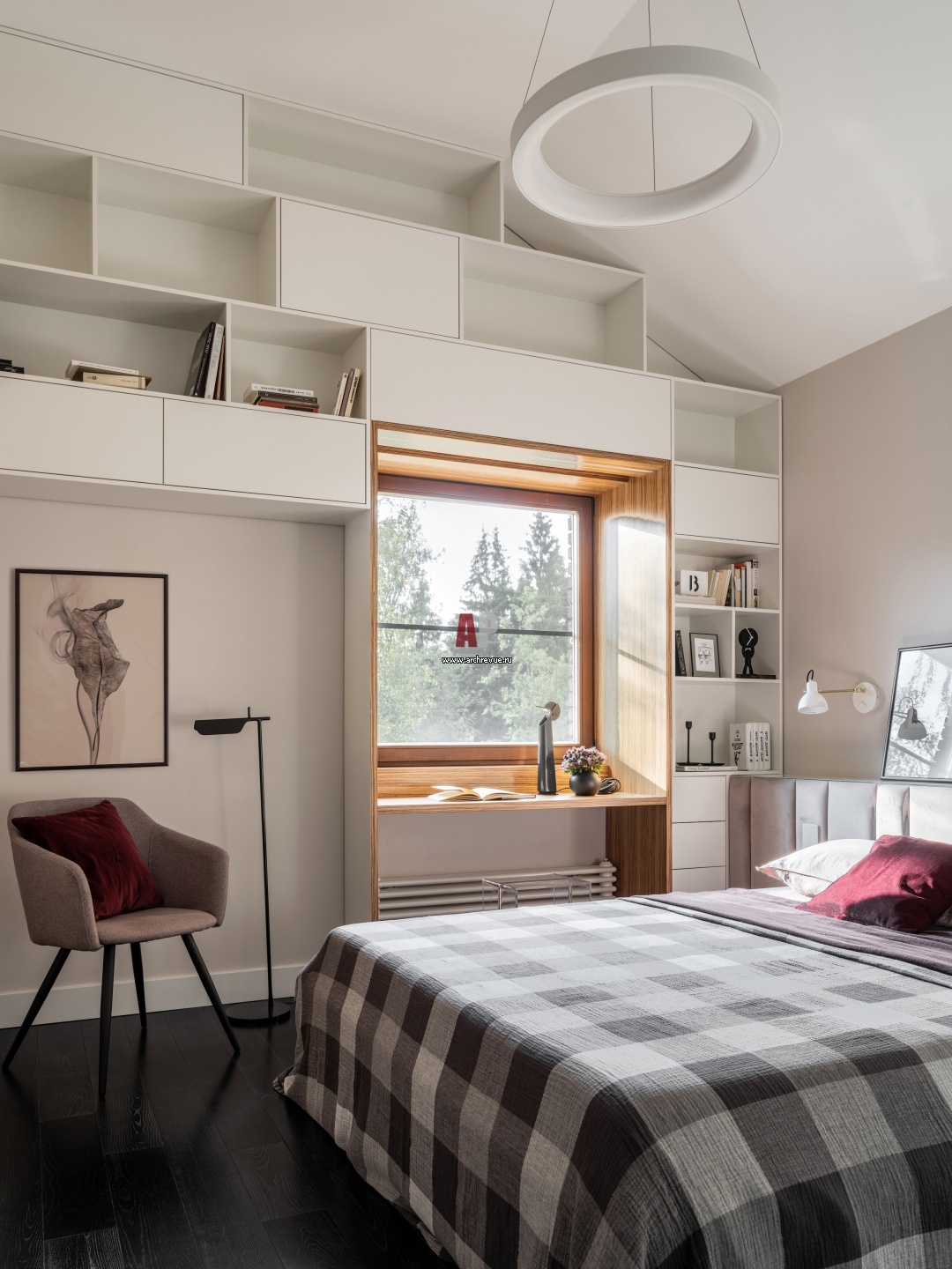 Гостевая спальня на втором этаже. Окно зашито деревом в виде рамы, где роль картины играет природа за окном.