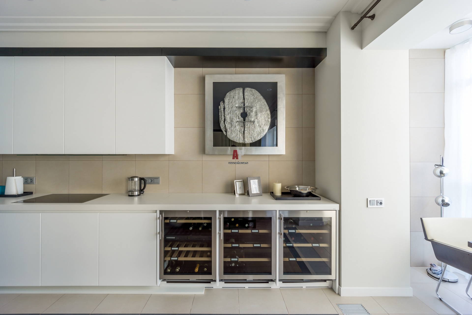 Зона кухни в интерьере квартиры-студии выглядит строго и лаконично. Минималистический гарнитур Boffi белого цвета с системой push up. Декоративное панно в серебряной раме гармонируют с современным настроением интерьеры.