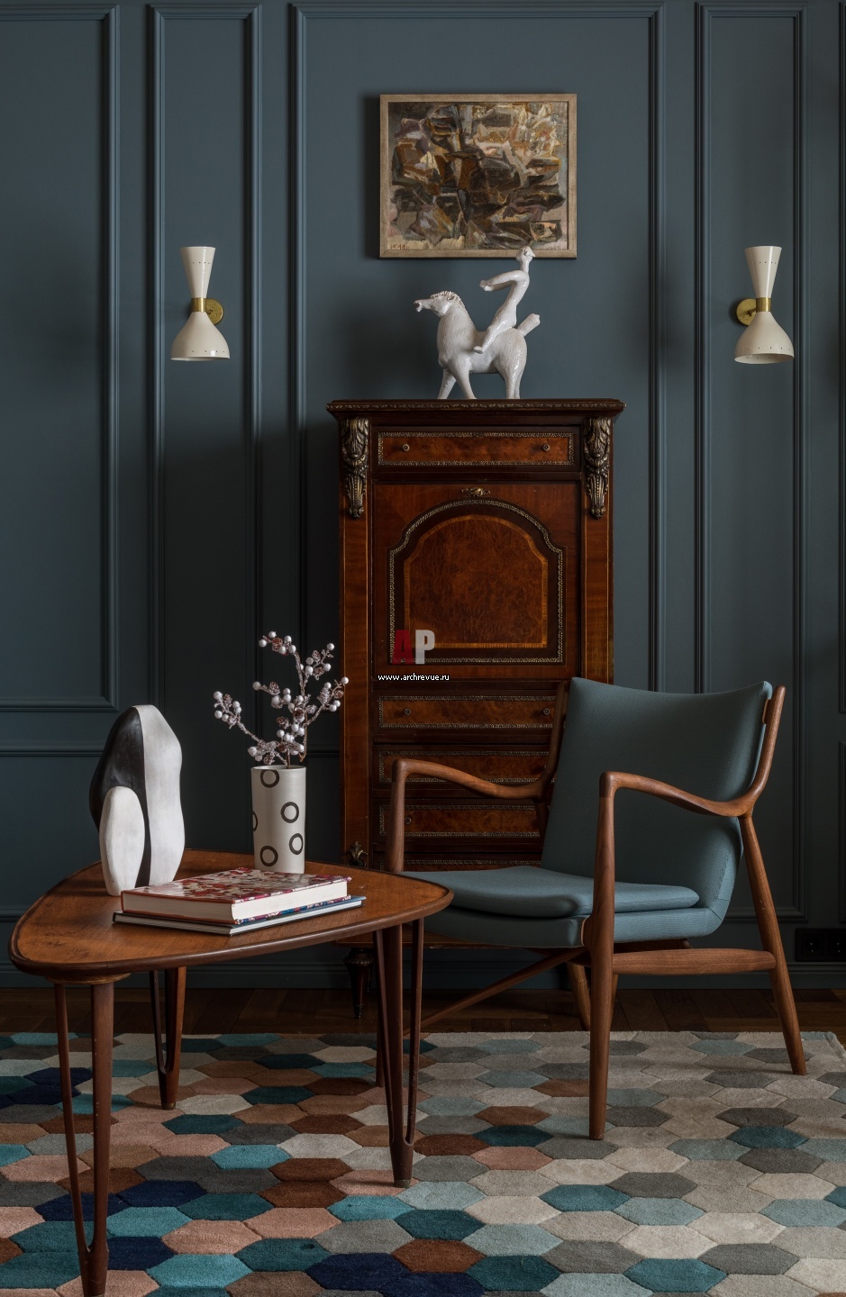 Зона отдыха в кабинете. Стены в кабинете выкрашены в сложный синий цвет. Краска, Sherwin-Williams, SW 7624. Комод из массива дерева, антиквариат, XIX век. Кресло, Finn Juhl, модель The 45 Chair. Белые бра, Италия, 1970-е гг.