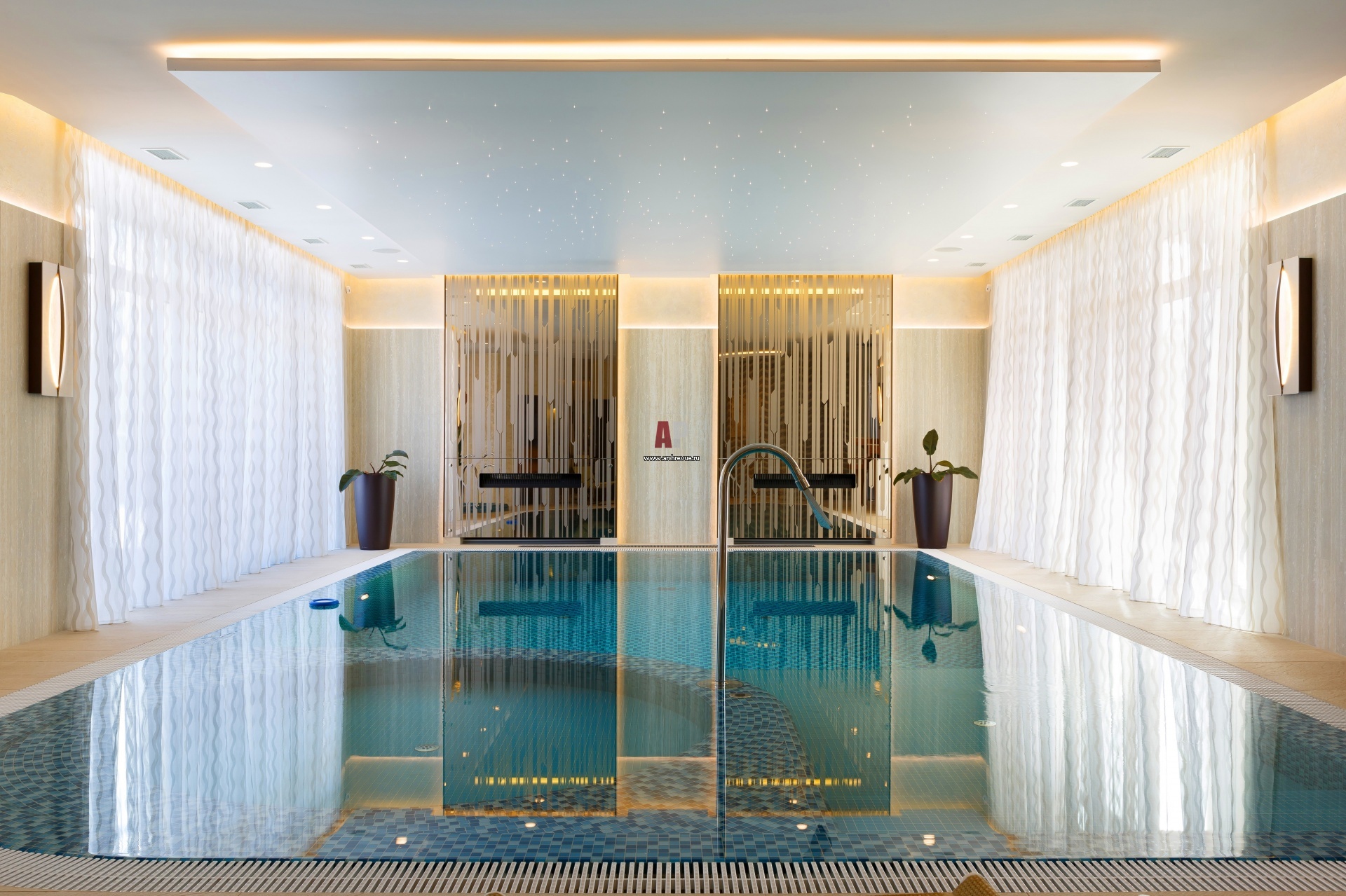 Чаша бассейна оформлена мозаикой, стены облицованы плиткой под натуральный травертин, Mirage.