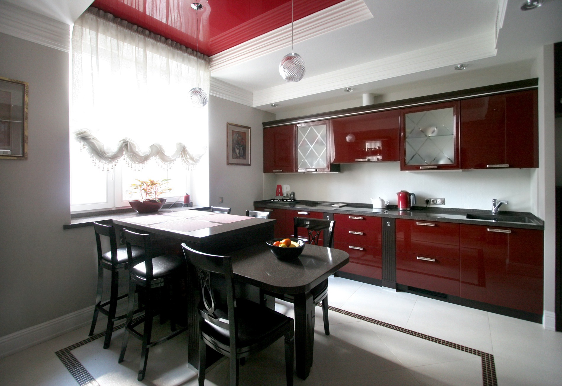 Расцветка мебели на кухне поддержана красным глянцевым натяжным потолком.