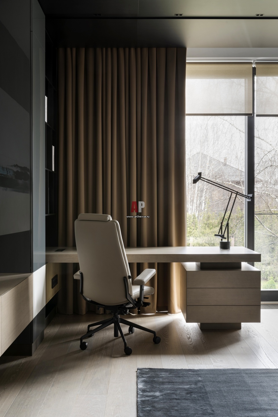 Комната сына гармонично сочетает в себе функции спальни, кабинета. Рабочая зона у окна. Настольная лампа, Artemide.