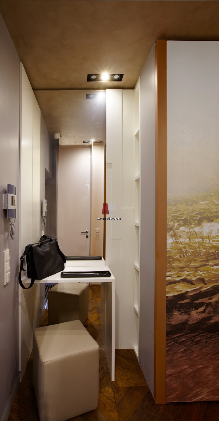 Интерьер небольшой прихожей в современном стиле. Белая глянцевая консоль придвинута к зеркалу в полный рост.