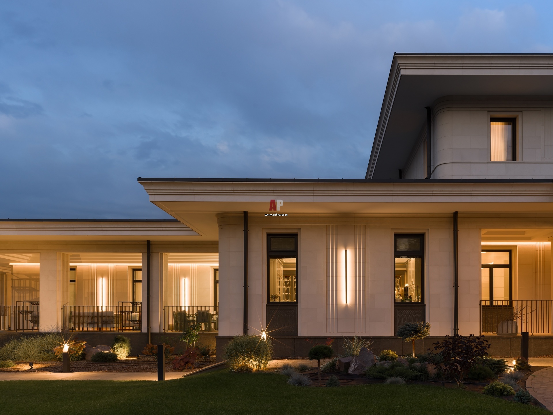 Неоклассическая вилла в Алма-Ате. Центральный объем с террасами при вечернем освещении.