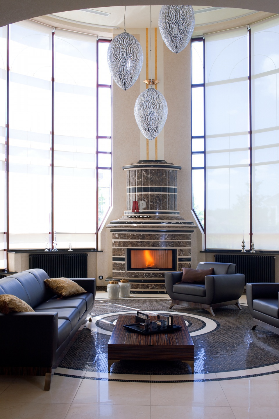 Камин по эскизам архитектора в форме двух массивных цилиндров. Обрамление камина выполнено из трех сортов мрамора: Crema Marfil, Nero Markina и Imperador Dark.
