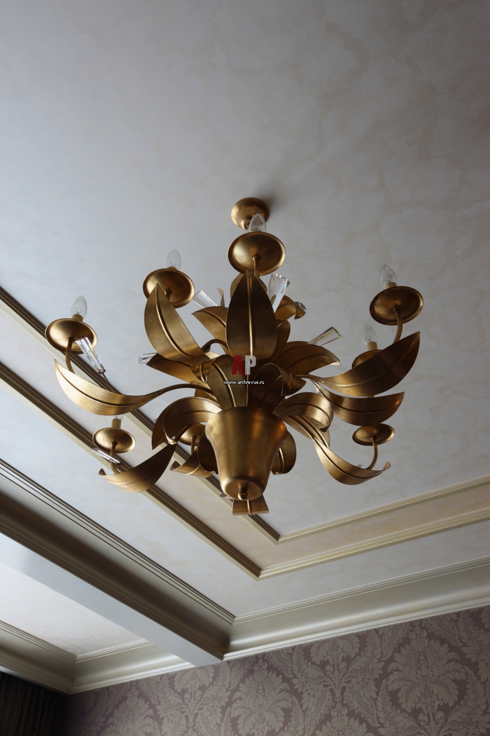 Потолки усложнены лепными кессонами и декоративными покрасками. Гипсовый декор, по авторским эскизам, изготовление «Дикарт».