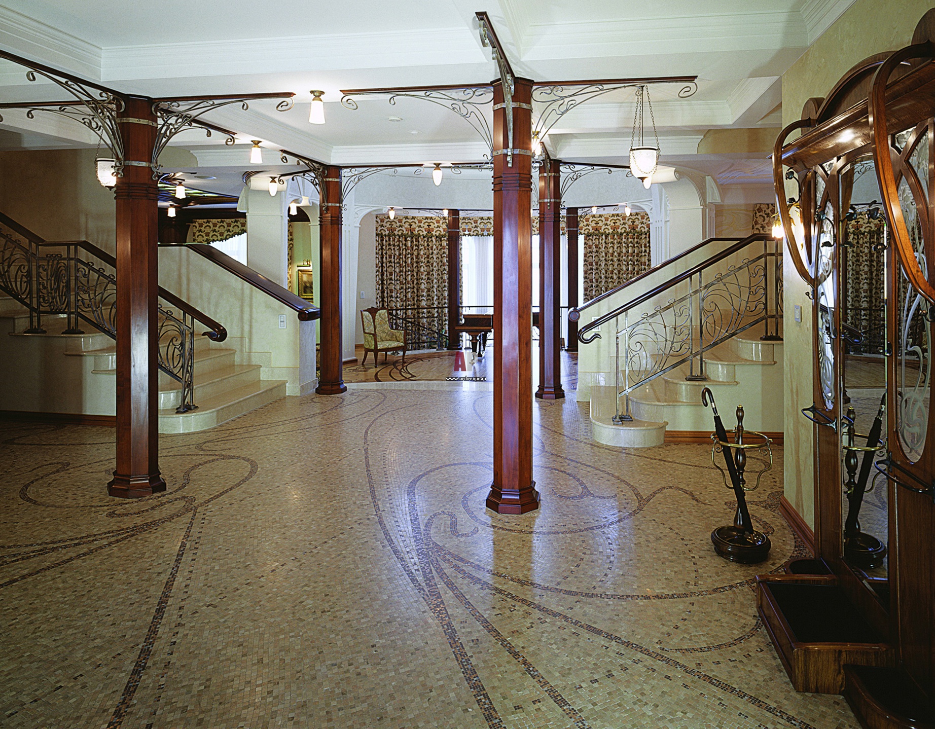 Вестибюль выглядит торжественно и парадно благодаря деревянным колоннам с тонкими расщепляющимися металлическими капителями, изготовление «Ковка СD». На полу – наборная мраморная мозаика нескольких цветов, поставщик «Центральная мастерская гранитного и мраморного строительства».