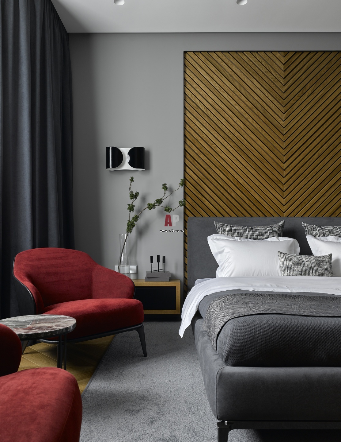 Хозяйская спальня. Прикроватная тумба сделана на заказ. Бра, Flos, модель Foglio. Журнальный столик с каменной столешницей B&B Italia, модель Eileen. Красные кресла, Minotti, модель Leslie.