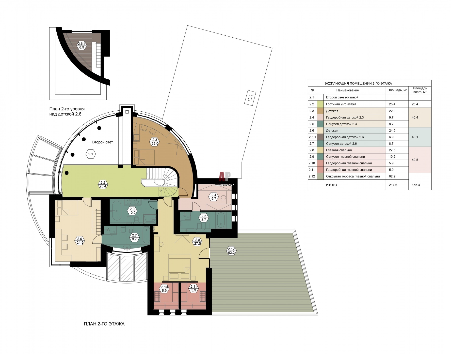 Площадь 2 этажа 2-х этажного дома с центральным радиусным объемом.