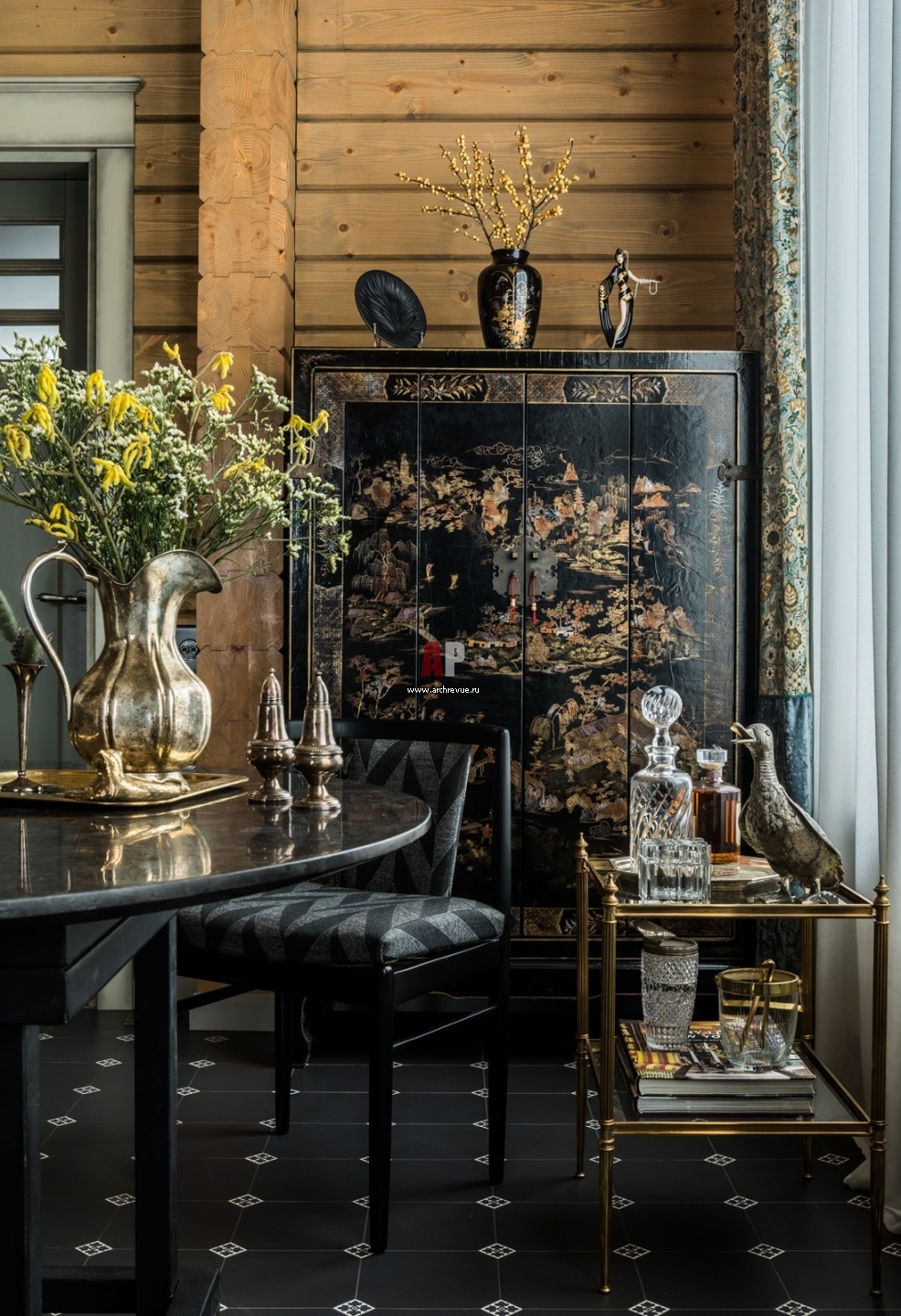 Деревянный дом с предметами старины. Антикварный комод в стиле шинуазри и сервировочный столик, винтаж. На комоде – декоративная тарелка Lalique и статуэтка Erte.