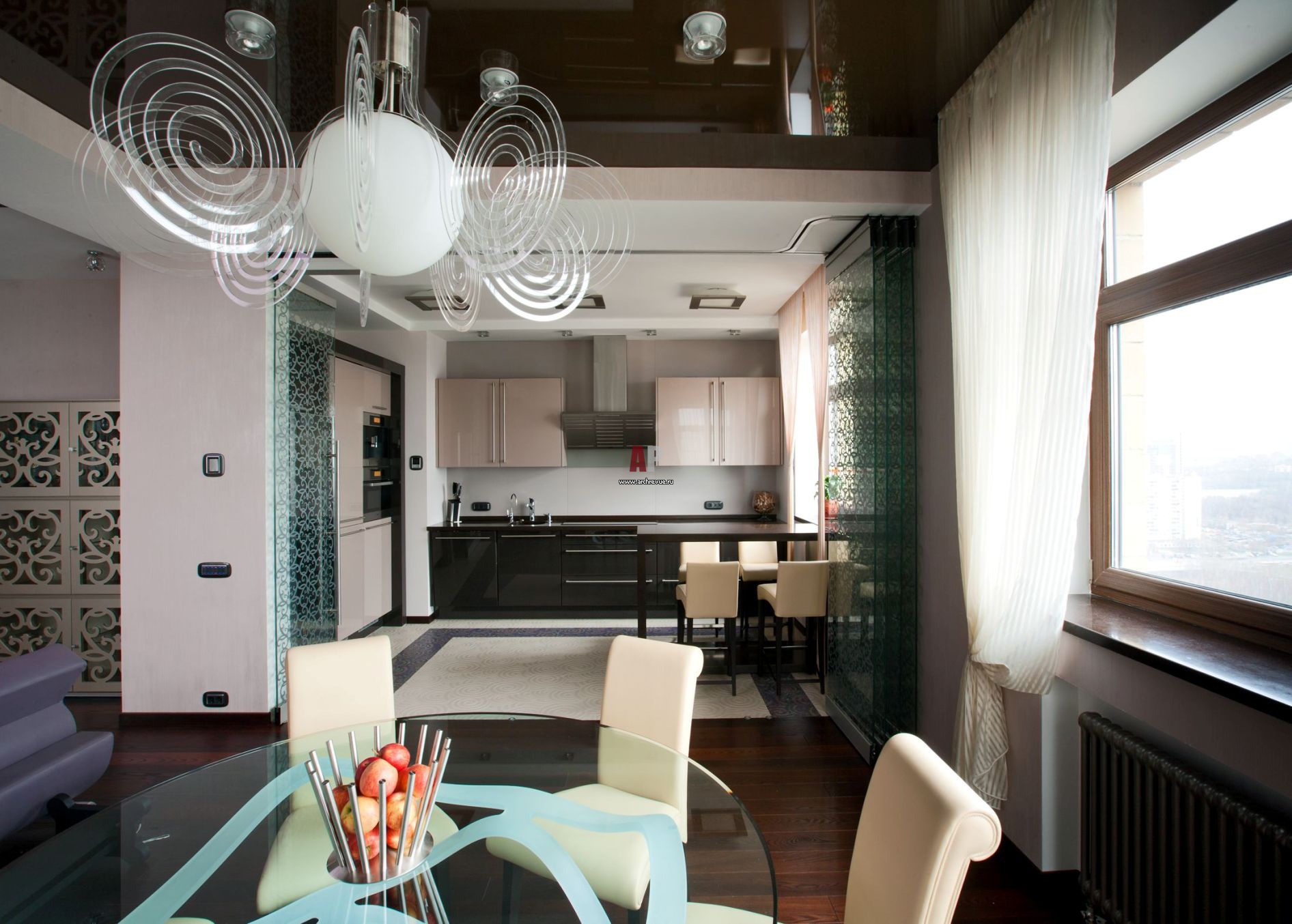 Столовая объединена с гостиной. Как продолжение гостевой зоны выглядит кухня. Она отделена стеклянными перегородками с ажурным рисунком по эскизам дизайнеров, изготовление Dorma .