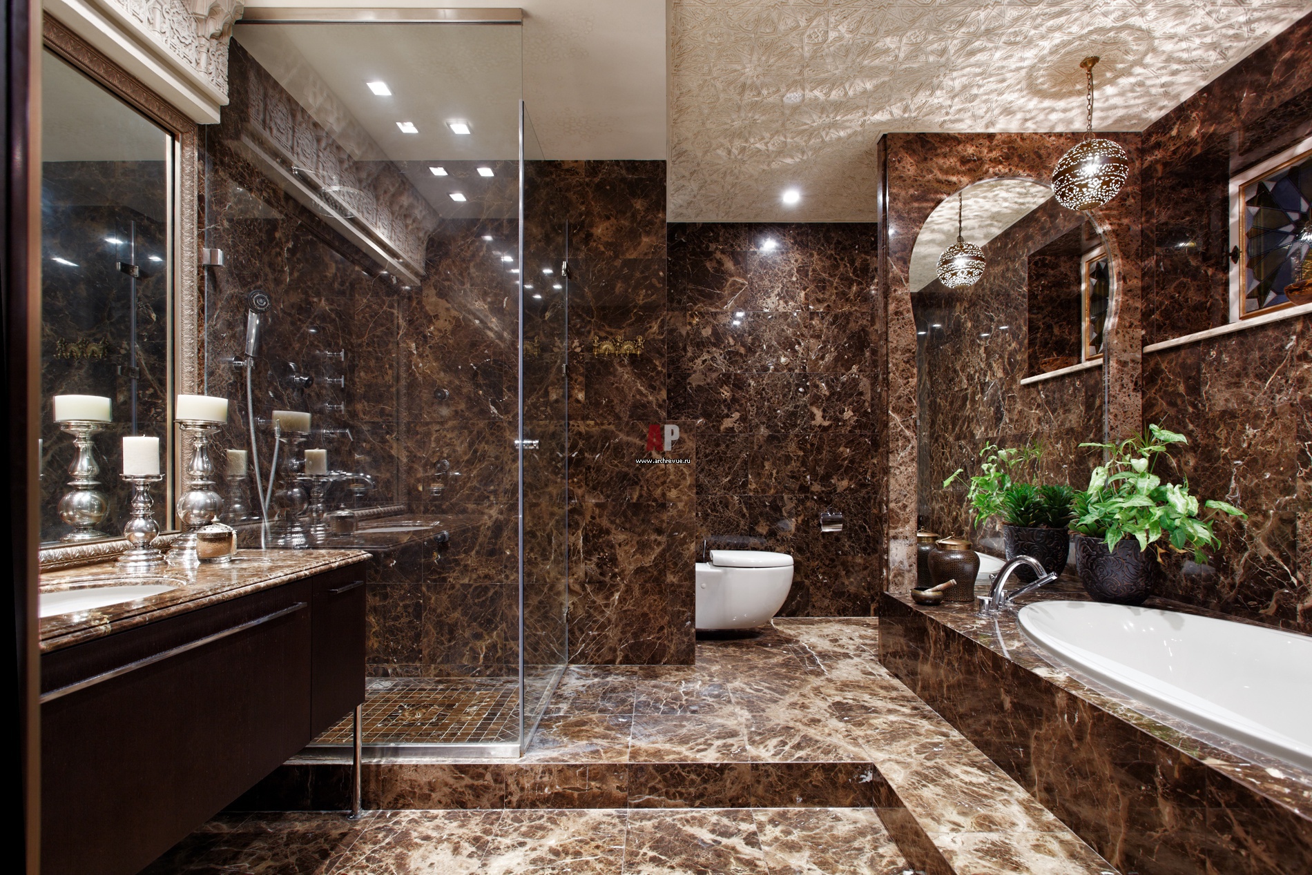 Карнизы и потолок в хозяйской ванной украшены восточным орнаментом. Они выполнены методом резьбы по ракушечнику.