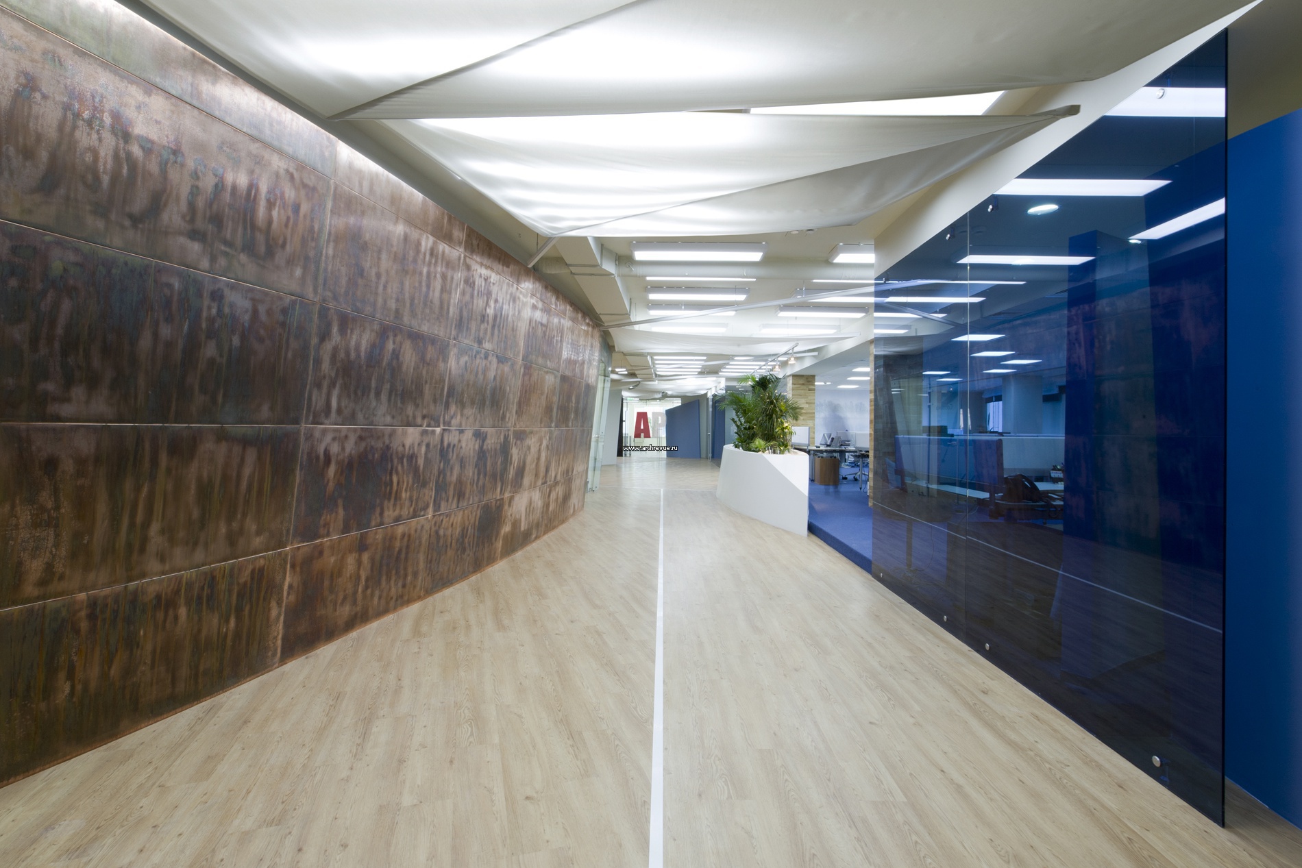 Интерьер холл в минимализме. Авторы проекта Петр Зайцев, Арсений Борисенко, архитектурное бюро za bor. Стеклянные перегородки тонированы синей пленкой.