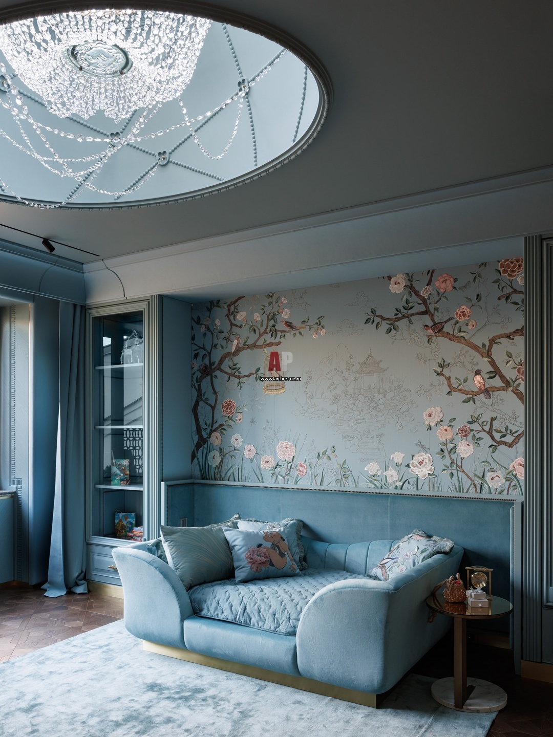 Детская нежно-голубого цвета. Потолочный плафон украшен люстрой с рельефным медальоном из запеченного стекла – головой Медузы горгоны. На стене — панно с вышивкой в стиле шинуазри.