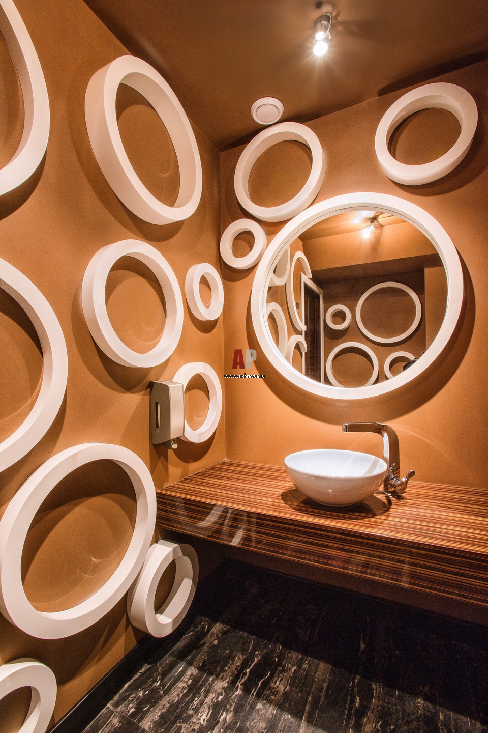 Фото дизайна интерьера туалетной комнаты в ресторане. На коричневом фоне эффектно смотрятся массивные круги разного диаметра из белого суперпрочного пластика.