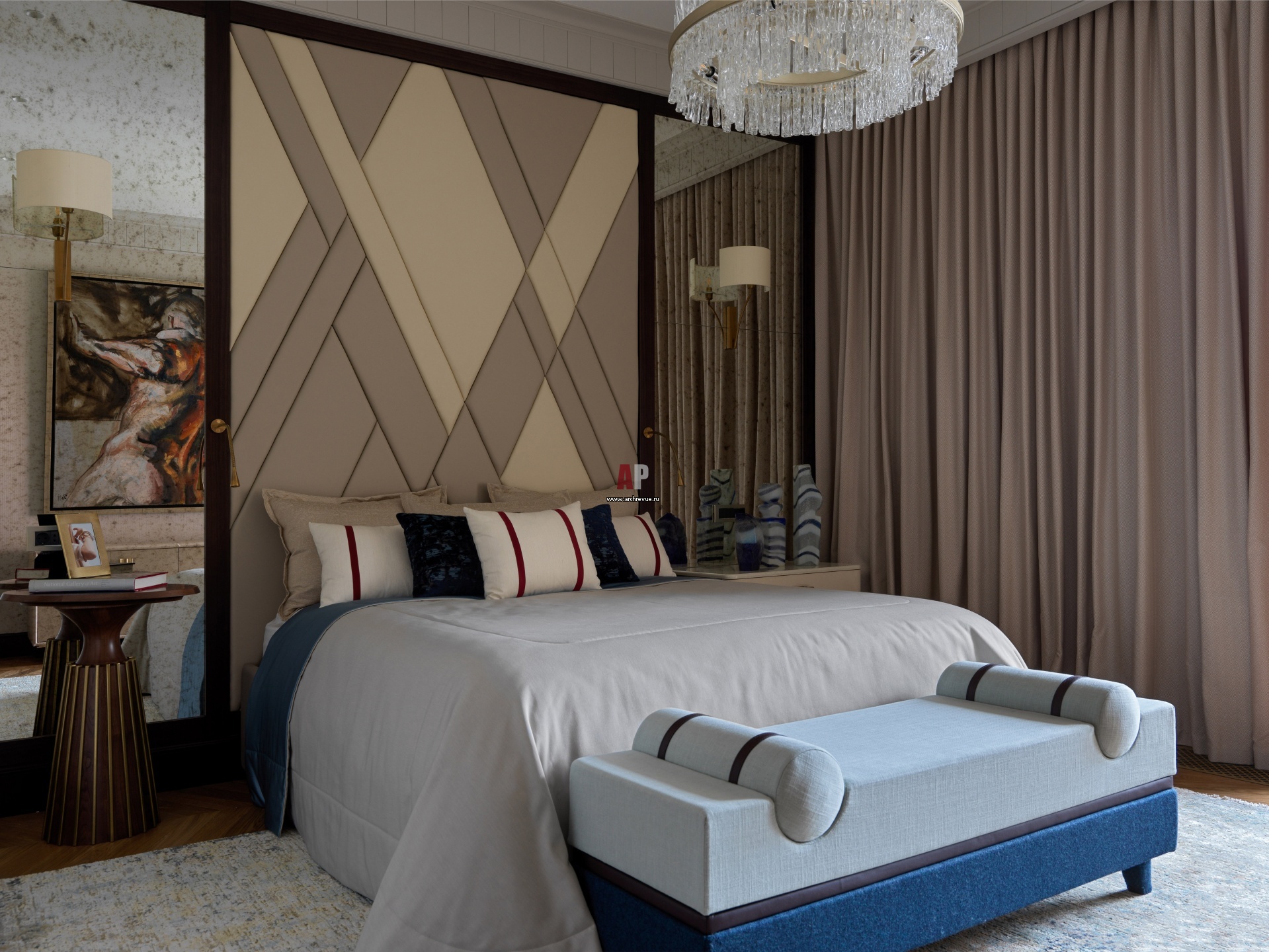 Идея спальни – крупный абстрактный орнамент, отсылающий к эстетике кубизма и супрематизма. Кровать и прикроватные тумбы сделаны на заказ. Люстра, Corbett Lighting.