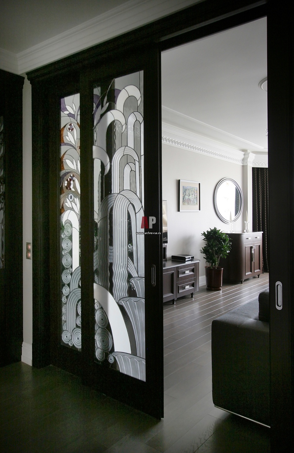 За четырехстворчатыми витражными раздвижными панелями с витражами находится гостиная. Витражи, на заказ, изготовление «Александрия».
