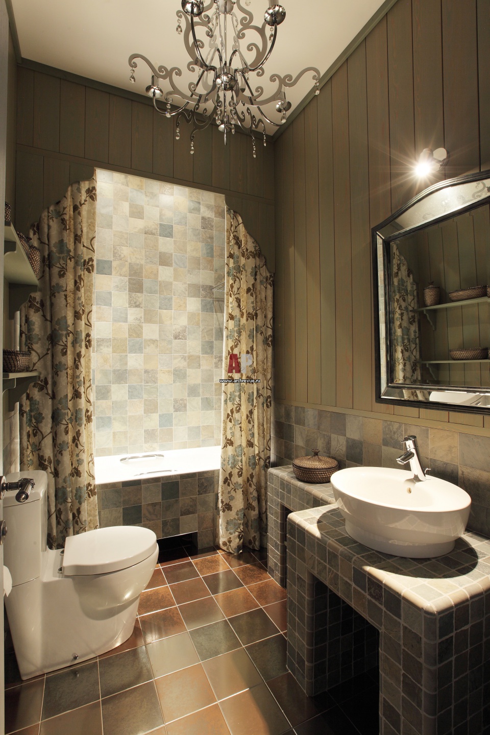 Фото интерьера гостевого санузла. Подстолье для раковины, полы, облицовка фасада ванны исполнены в едином стиле. Использована плитка от Casa Dolce Casa.