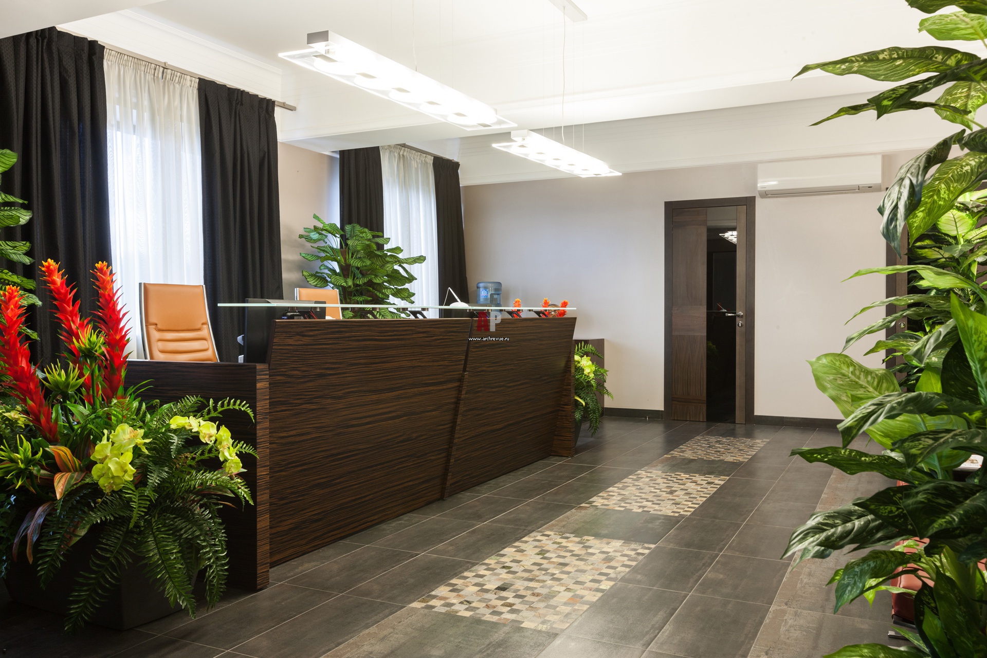 Фото входной зоны представительского офиса. Стойка рецепции выполнена из тика в стиле ар-деко. На полу – керамогранит, имитирующий фактуру натурального сланца, со вставками из мраморной мозаики.