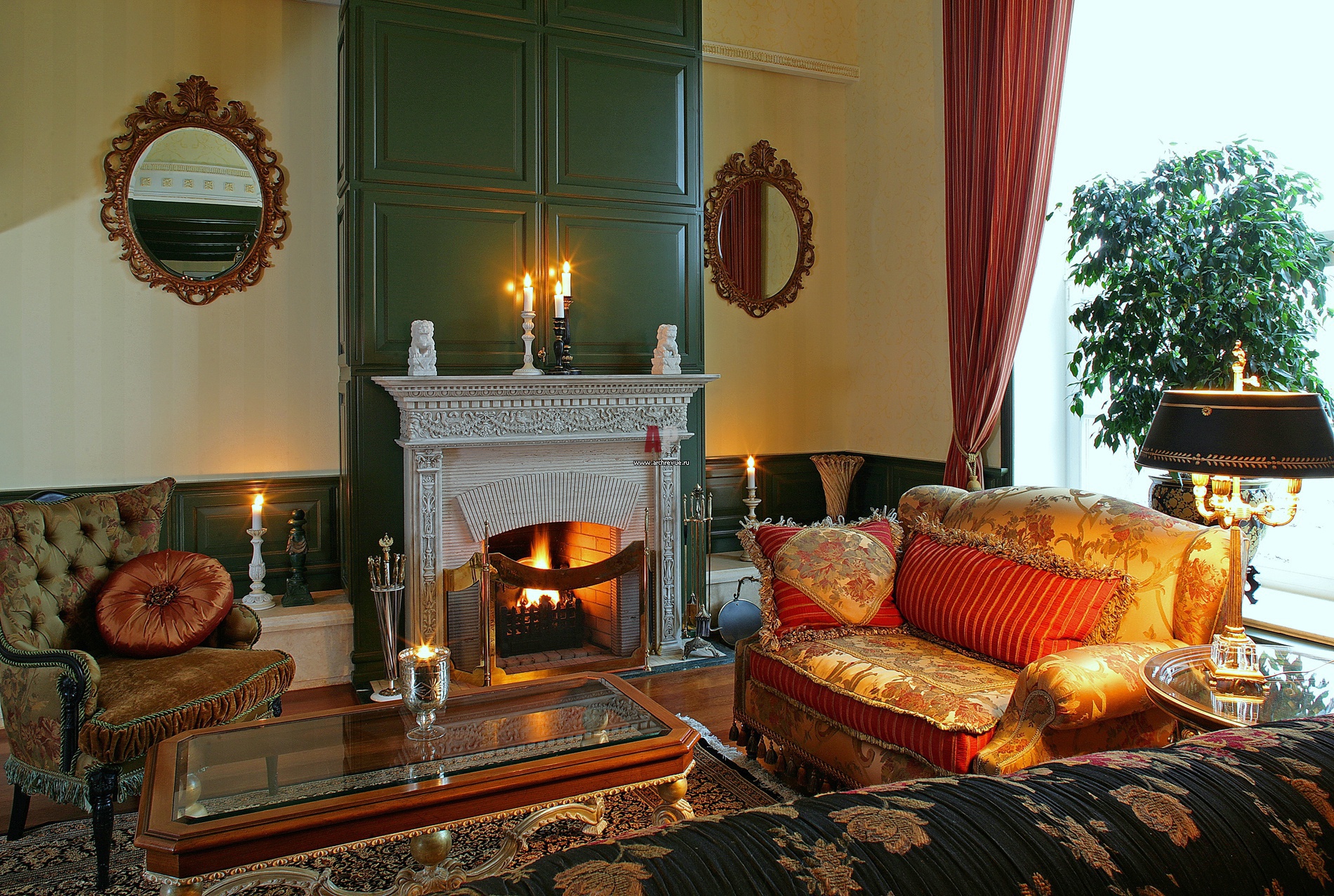 Камин с резным мраморным порталом, имитирующим старинный, выполнен по эскизу архитекторов мастерами из Санкт-Петербурга.