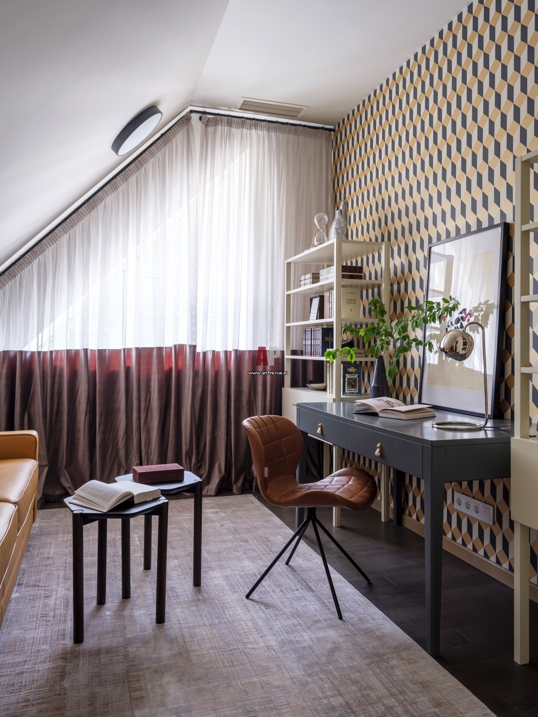 Кабинет в мансарде. Письменный стол, The Idea. Стеллажи по эскизам дизайнера. Журнальные столики и стул, DesingBoom. Рыжий кожаный диван, Estetica.