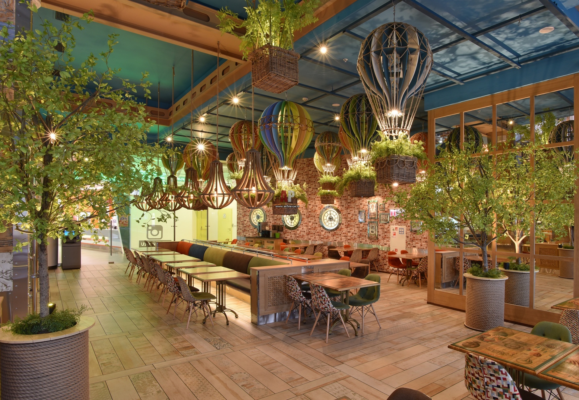 Идею полетов продолжают размещенные над обеденными зонами под высоким потолком модели разнообразных летательных аппаратов – воздушные шары, кашпо с растениями, игрушечные самолеты, оригинальные светильники из фанеры.