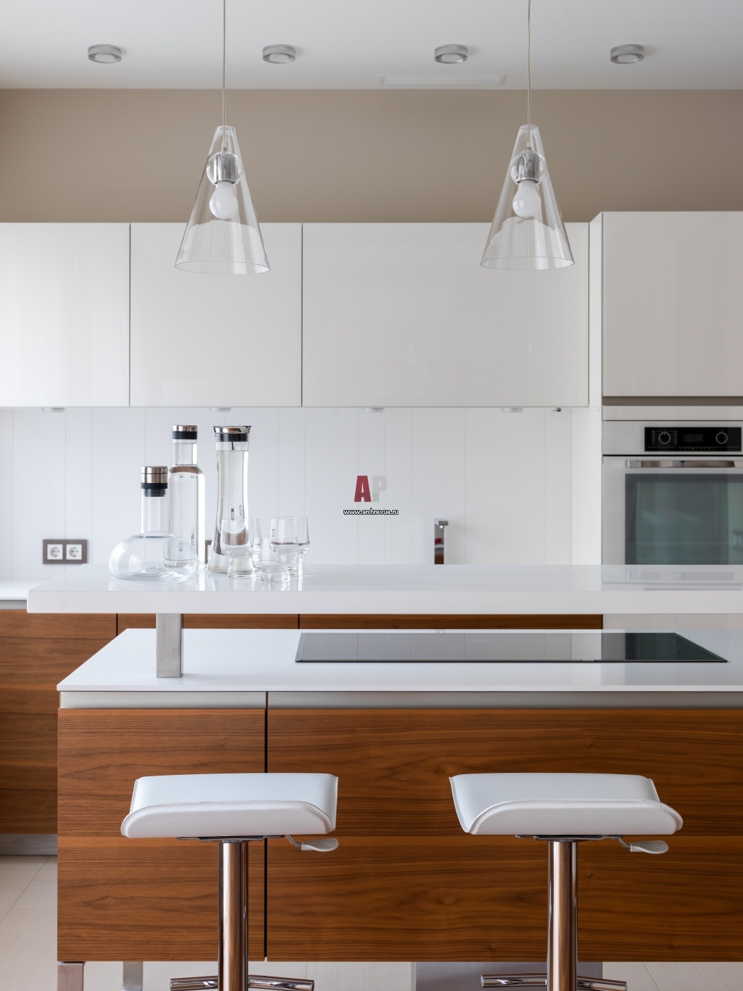Интерьер кухни в стиле минимализм. Кухня, Rational. Подвесные светильники, Vistosi. На столешнице и фартуке – белый искусственный камень, кварцит.